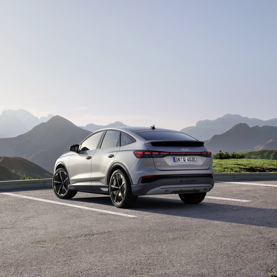Q4 e-tron er en praktisk SUV med imponerende plass og premiumfølelse. Den har et moderne, skarpt design med en markant front, aerodynamiske linjer. quattro firehjulstrekk er standard, og med forvarming av batteriet lades bilen raskt selv under kalde forhold.